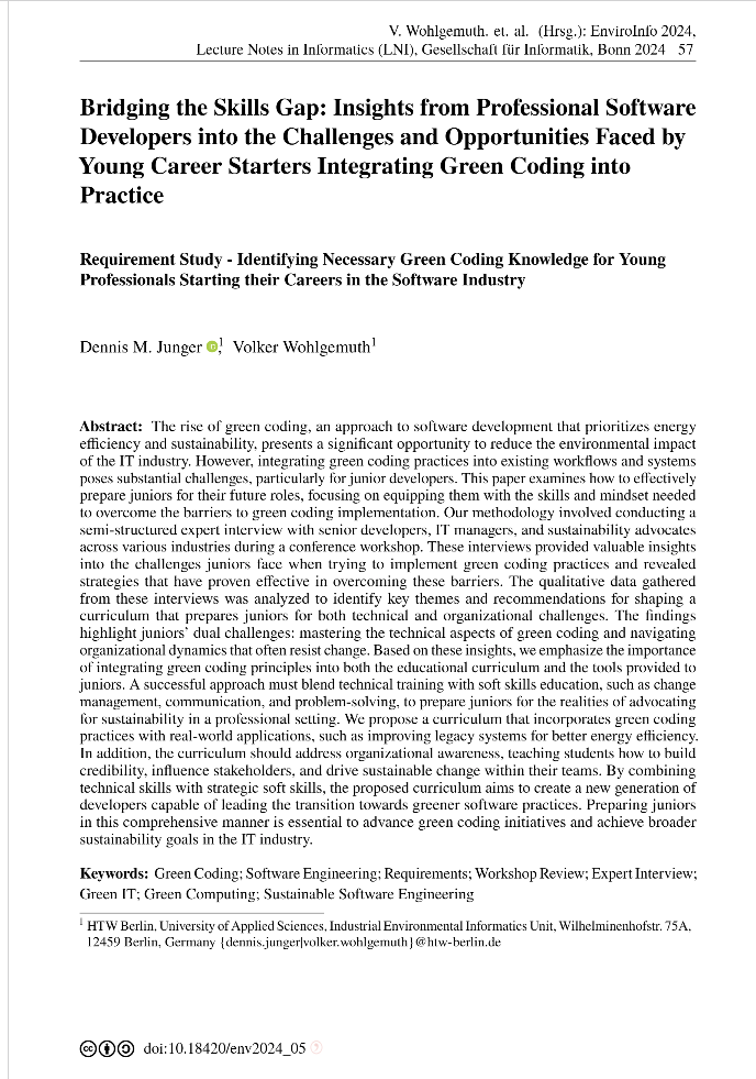bridging Veröffentlicht am 24. März 202524. März 2025 von dennis ← Vorheriger Nächster → Bridging the Skills Gap: Insights from Professional Software Developers into the Challenges and Opportunities Faced by Young Career Starters Integrating Green Coding into Practice Requirement Study -Identifying Necessary Green Coding Knowledge for Young Professionals Starting their Careers in the Software Industry Konferenzbeitrag, 2024