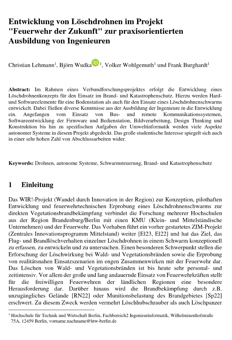 Entwicklung von Löschdrohnen im Projekt Feuerwehr der Zukunft zur praxisorientierten Ausbildung von Ingenieuren Veröffentlicht am 21. Februar 202421. Februar 2024 von dennis ← Vorheriger Nächster → Entwicklung von Löschdrohnen im Projekt „Feuerwehr der Zukunft“ zur praxisorientierten Ausbildung von Ingenieuren Konferenzbeitrag, 2023