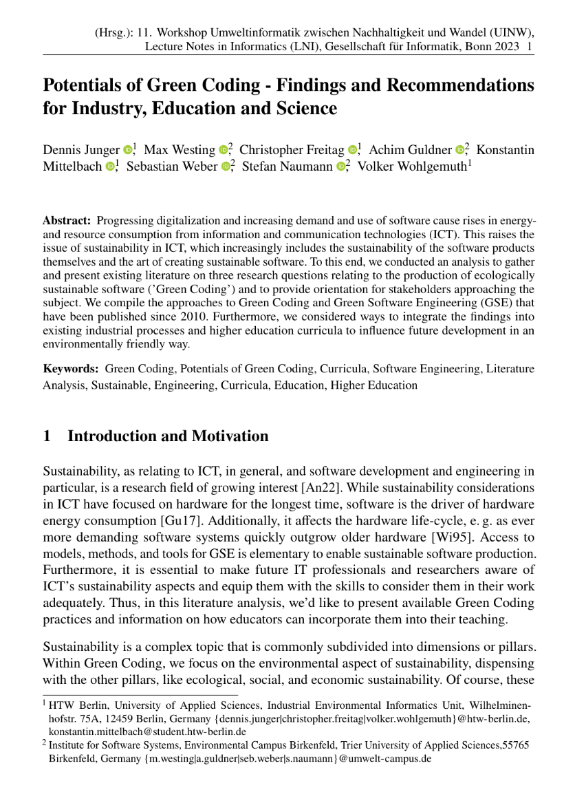 Potentials of Green Coding -Findings and Recommendations for Industry, Education and Science Veröffentlicht am 21. Februar 202421. Februar 2024 von dennis ← Vorheriger Nächster → Potentials of Green Coding -Findings and Recommendations for Industry, Education and Science Konferenzbeitrag, 2023