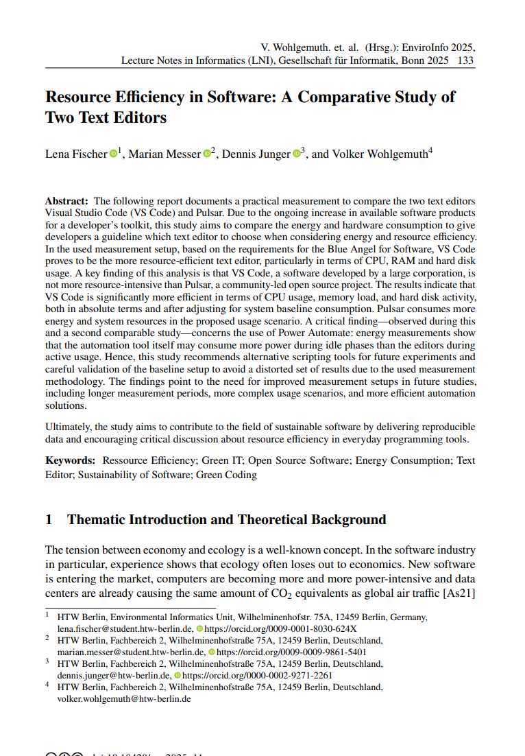 vscode Veröffentlicht am 7. November 20257. November 2025 von dennis ← Vorheriges Nächstes → Resource Efficiency in Software: A Comparative Study of Two Text Editors Beitrag Konferenzband, 2025